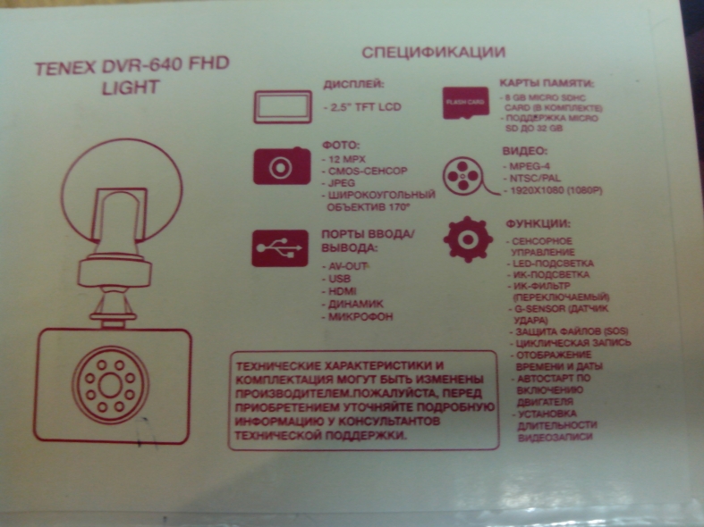 На торце коробки с устройством были приведены основные функции и технические данные Tenex DVR 640 FHD. Фотография приведена ниже.