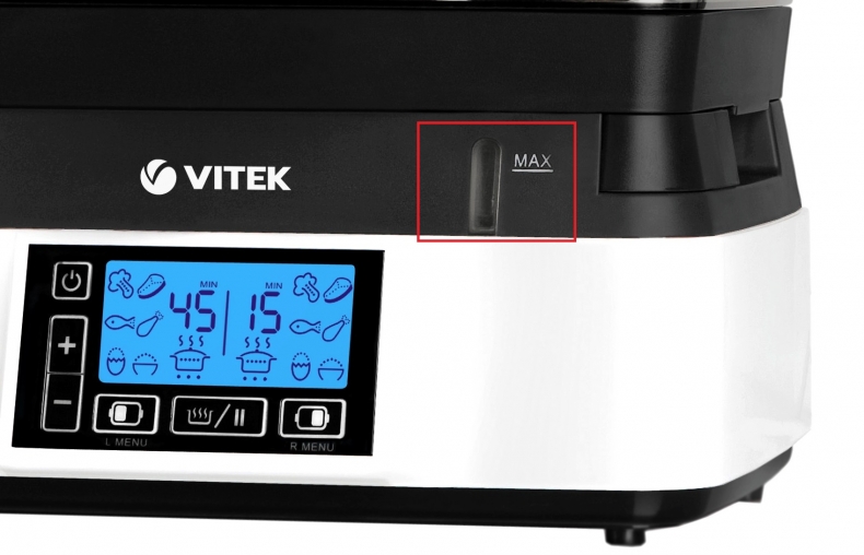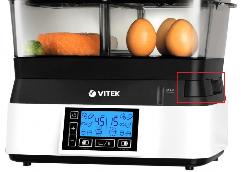 Поскольку основой для приготовления блюда в пароварке является вода, то очень важно следить за ее количеством в резервуаре. Для контроля воды имеется специальный индикатор, который показывает ее текущий уровень.