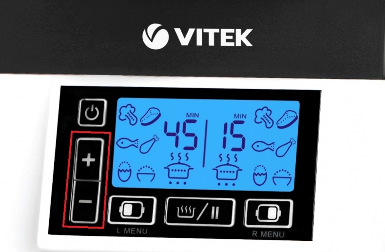 Воспользовавшись этими кнопками, вы имеете возможность настроить индивидуальные режимы для левой и правой зон приготовления. При необходимости можно изменить продолжительность варки. Данная манипуляция проводится в том случае, если установленное по умолчанию время приготовления вас не устраивает. Изменить данный параметр можно при помощи кнопок «+» и «-».