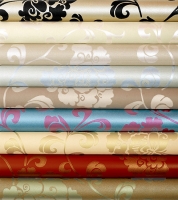 Глубоким тоном и мягкой фактурой отличаются фетровые обои, изготовленные из бумаги с нанесением на ее поверхность волокон вискозы, полиэстера и акрила, отдельно окрашенными и скрепленными без переплетения. Отметим, что любые пятна на фетровых обоях можно смыть мягкой губкой. Измеряются такие изделия погонными метрами. Интересное новшество в мире текстильных обоев- бесшовные покрытия на бумажной или поролоновой основе. В отличие от текстильных обоев, которые как и обычные, имеют определенную ширину и клеятся полосами, эти покрытия выпускаются одним рулоном. Ширина полотна таких рулонов подбирается под высоту потолка (2.6 – 3,1 м), а длина рулона достигает 100 м – этого хватает, чтобы «обернуть» помещение по периметру изнутри. Таким образом получается один шов. После этого вырезают оконные и дверные проемы.