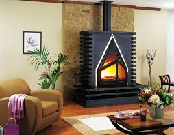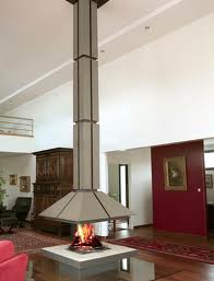 Отдельно стоящий камин в центре большого помещения является автономным очагом и относится к открытым топкам. Это ровная плоская площадка, которая значительно возвышается над уровнем пола, на ней и разводится огонь. Специальный дымоход устанавливается непосредственно над пламенем. Такой камин имеет оригинальную конструкцию, которая отдаленно напоминает пламя костра в походных условиях.