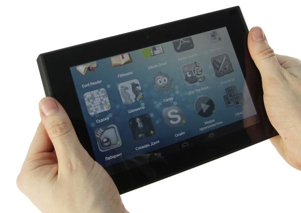 Скошенные грани только первые несколько минут вызывают непривычные ощущения, но уже спустя 10-15 минут полностью привыкаешь к необычной форме планшета. Благодаря небольшому весу (384 грамма) планшет легко держать на весу одной рукой.
