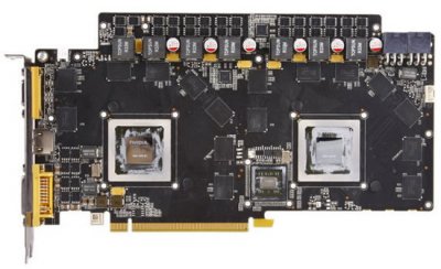 Эта новинка построена на дизайнерской плате черного цвета. Специальный чип NVIDIA nForce 200 (BR04), ответственный за реализацию технологии NVIDIA SLI, установлен между чипами G92b. Помимо этого она оснащена 16-ю микросхемами GDDR3 с 256-битным интерфейсом и временем выборки 1,0 нс от Hynix.
