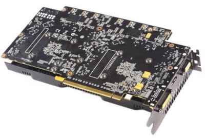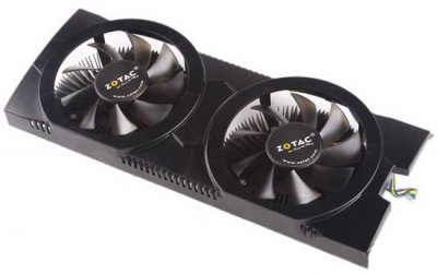 Охлаждение видеокарты возложено на мощный двухслотовый активный кулер, сверху закрытый черным пластиковым корпусом, в который заключены два достаточно крупных вентилятора.