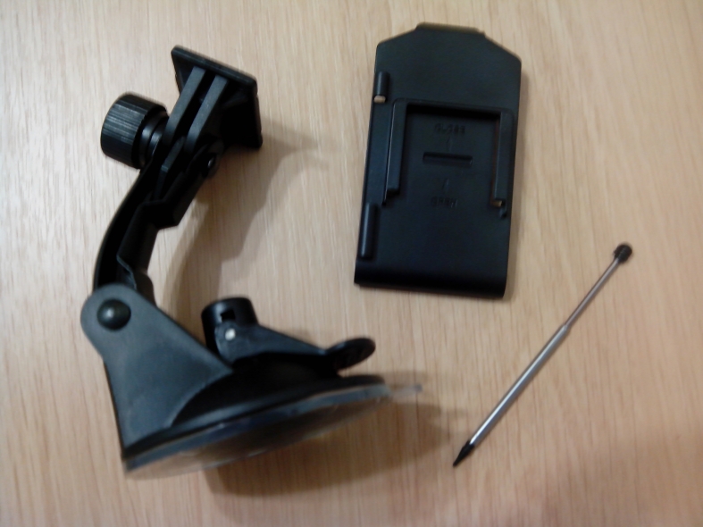 Тепер перейду до опису кріплення на лобове скло. В даному навігаторі кріплення складається з присоски з двома гвинтами, які регулюють положення навігатора в горизонтальній і вертикальній площинах, кріпильної кліпси і стилуса, який вставляється в задню частину цієї кліпси. Завдяки такій конструкції можна зручно відрегулювати положення навігатора в автомобілі і при цьому надійно закріпити його на лобовому склі.