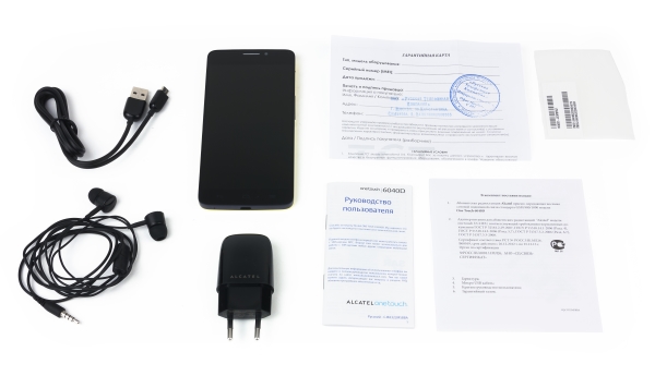 Alcatel One Touch Idol X 6040D поставляється в невеликій картонній коробці білого кольору. Коробка має лаконічне оформлення, при цьому на ній зображено придбане пристрій і нанесена вся необхідна інформація. Комплектується смартфон гарантією, інструкцією, рекламною брошурою, навушниками-вкладишами, зарядним пристроєм (1000 міліампер) і інтерфейсним кабелем. Навушники оснащені звичайним дротом, не лапшевідним, тому вони можуть легко заплутатися в кишені або сумці.