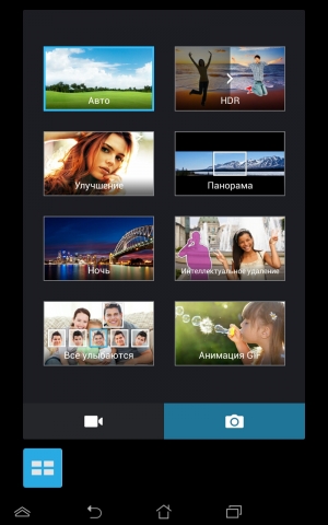 Якщо утримувати планшет в горизонтальній орієнтації, то в правій частині інтерфейсу камери користувач побачить мініатюру останньої відзнятої фотографії, іконки переходу від фотозйомки до запису відео (і навпаки), повзунок зума і віртуальну кнопку вибору режиму зйомки (для фото - авто, панорама, поліпшення , інтелектуальне видалення, ніч, всі посміхаються, анімація Gif, HDR; для відео - інтелектуальний режим і уповільнена зйомка). У лівій частині екрана знаходяться іконки зміни камери (з тильної на фронтальну і назад), додавання ефектів (піпетка, в море, вінтаж, негатив, LOMO, ностальгія, градації сірого, вампір, прилад нічного бачення) і налаштувань.