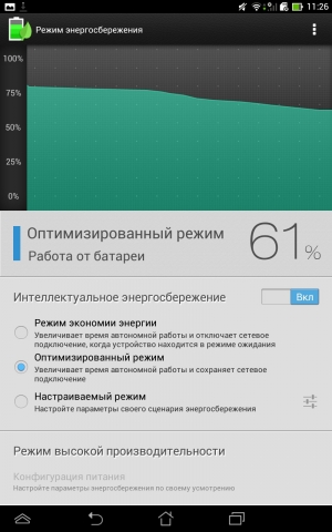 Користувач може збільшити автономність пристрою, вибравши в налаштуваннях і активувавши один з трьох режимів енергозбереження: режим економії енергії, оптимізований режим і настроюється режим. У режимі економії енергії відбувається автоматичне відключення бездротових модулів. В оптимізованому режимі час автономної роботи збільшується, але бездротові комутаторів для послуг не відключаються. У розширеному режимі користувач може налаштувати яскравість екрану при відтворенні музики, перегляді відео, веб-серфінгу.