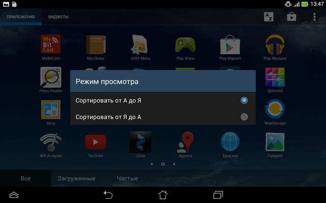 Головне меню являє собою матрицю, що складається з іконок додатків. У лівому верхньому кутку екрану знаходяться вкладки «Додатки» і «Віджети». У правому верхньому куті екрану можна побачити іконки зміни режиму перегляду, входу в магазин додатків Google Play і контекстного меню. Сортувати додатки можна за алфавітом від А до Я і від Я до А. У правому нижньому кутку екрану знаходяться три вкладки - «Все», «Завантажені» і «Часті».