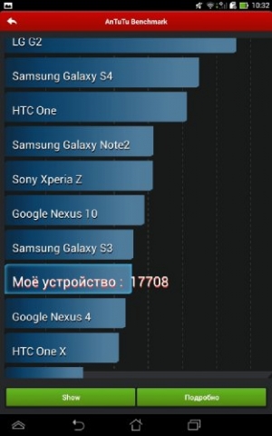 У синтетичному тесті AnTutu девайс демонструє дуже пристойний результат - 17708 балів. Аналогічний результат демонструють такі популярні модулі смартфонів, як Samsung Galaxy S3, HTC One X і LG Google Nexus 4.