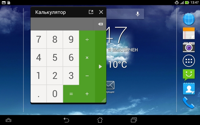 У самому низу дисплея можна побачити чотири віртуальні кнопки управління апаратом - «Назад», «Додому» (повертає на головний робочий стіл), «Диспетчер запущених додатків» і клавіша доступу до додатків, які можуть відкриватися поверх всіх вікон. Після натискання на останню іконку внизу дисплея з'являється рядок зі слайдами восьми міні-додатків. Користувач може прибирати з цього рядка непотрібні додатки і додавати інші з доступного списку. До віджетів відносяться калькулятор, відеоплеєр, компас, словник, секундомір, конвертер величин, блокнот, YouTube, AudioVizard, календар. Google Now тощо. Користувач може розміщувати ці додатки в будь-якій частині екрану, змінювати їх розмір.