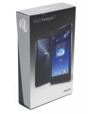 Поставляється Asus Fonepad 7 в картонній коробці чорно-білого кольору, на передній стороні якої є зображення набутого планшета. На тильній частині коробки вказані характеристики девайса, а на правій боковині вказується колір апарату. Комплектується пристрій інструкцією, підставкою, гарантією, блоком живлення (1,35 ампера), кабелем USB і спеціальної «скріпкою» для відкриття лотка з SIM-картою.