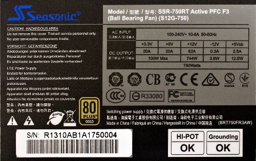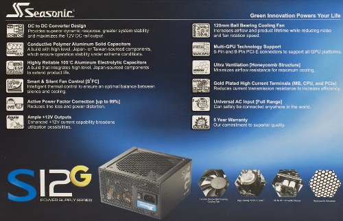 Та й тильна сторона ніяких відмінностей від продуктів серії «G» не має, тому для ідентифікації виробів серії «S» виробникові довелося розмістити на їх боковинах спеціальну наклейку з написом «S12G», яка красномовно говорить про те, що джерело енергії «Seasonic SSR-750RT 750W» є заміною застарілої серії «S12II Bronze» шляхом установки на неї схемотехніки від «золотої» серії «G».