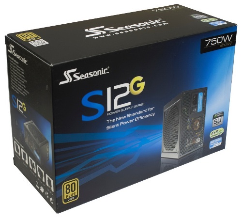 На лицьовій стороні коробки виробник, крім інформації про потужності, серії та отриманому «золотом» сертифікаті, вказав потенційному покупцеві на можливість побудови на базі вкладеного вироби конфігурації з центральним процесором «Haswell» і декількома відеокартами при збереженні високої ефективності енергозбереження. Для кращої візуалізації виробу покупцем без необхідності відкриття упаковки, а також з метою демонстрації привабливості його зовнішнього вигляду, виробник наніс на лицьову сторону коробки фотографію продукту, на якій особливу увагу привертає стільникова конструкція осередків, призначених для поліпшення повітрообміну всередині «Seasonic SSR-750RT 750W» .