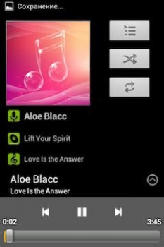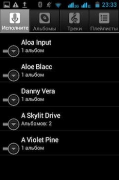 Інтерфейс стандартного аудиоплеера розділений на 4 вкладки (категорії сортування даних) - "Виконавці", "Альбоми", "Треки" і "Плейлисти". Безпосередньо з цього додатка відтворену композицію користувач може встановити в якості дзвінка для SIM1 або SIM2 (вкладка "Поставити на дзвінок"). Пункт "Звукові ефекти" в додатковому меню цього додатка надає доступ до еквалайзера, в якому можна не тільки активувати готові пресети, але і відрегулювати звучання вручну.