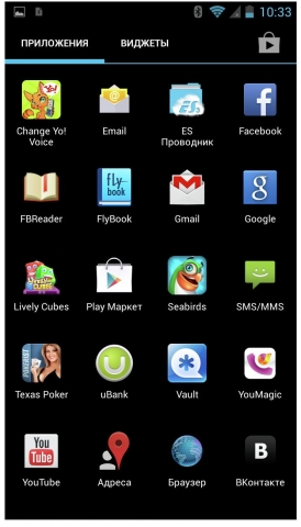 Головне меню являє собою матрицю 5х5, що складається з ікон всіх встановлених програм та ігор. Меню розділене на дві вкладки - «Додатки» і «Віджети». У верхній правій частині меню є іконка переходу в магазин Google Play.