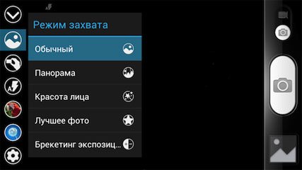 Опції в настройках камери зображуються у вигляді симпатичних круглих іконок. Тут можна вибрати режим захоплення (звичайний, краса особи, панорама, брекетінг експозиції, краще фото), спосіб захоплення (звичайний, посмішка, жест, киснем), режим роботи фотоспалаху. До знімків можна застосувати різні колірні ефекти (крейда на чорній дошці, під водою, монохром, сепія, негатив) і фотоефекти (Арктика, веселка, пізня осінь і інші). Крім того, користувач може самостійно вибрати баланс білого, режим зйомки, режим фокусування, дозвіл (від 0,1 до 8 мегапікселів), світлочутливість (від 100 до 1600 одиниць ISO) насиченість, яскравість і контрастність, активувати геотеги, автоспуск. Камера може здійснювати серійну зйомку.