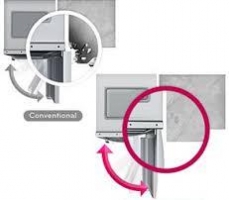 Навіть на малогабаритній кухні при відкритті дверцят холодильника вона не вдариться об стіну. Ящики можна висунути повністю, відкривши двері на 90 °.