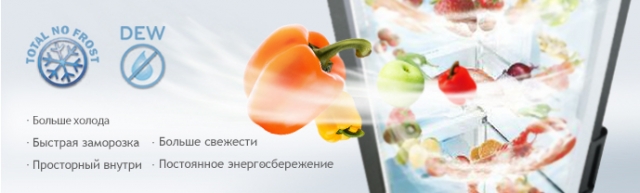 Завдяки системі Total No Frost розморожувати морозильну камеру не потрібно, в камері менше вогкості, відсутній конденсат. Обидві камери рівномірно охолоджуються, тим самим підтримують встановлену температуру з незначними відхиленнями між верхніми і нижніми полками. Камери швидко охолоджуються завдяки рівномірному розподілу потоків холодного повітря.