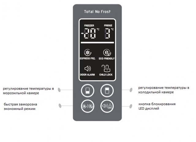 Завдяки дисплею температуру в холодильній і морозильній камерах можна контролювати окремо. Кнопки дуже зручні і натискаються м'яко. Спочатку в холодильній і морозильній відділеннях встановлено температуру 3 ° C і -20 ° C відповідно. За бажанням можна змінити температуру, натиснувши кнопку регулювання температури відділення.