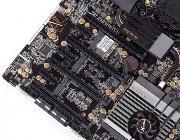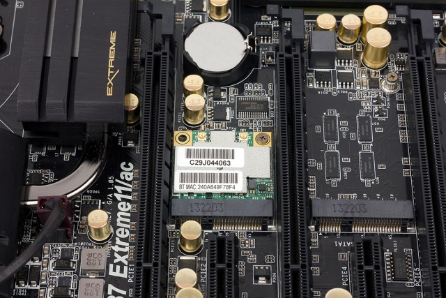 Правда, в разі організації масиву з трьох відеокарт всі роз'єми PCI Express 2.0 x1 будуть перекриті, так як розташовані вони між роз'ємами PCI Express 3.0 x16. Крім цього на платі розташований один роз'єм Mini PCI Express. Його робота організована за допомогою набору системної логіки. Правда, він спочатку зайнятий. У нього встановлений модуль Wi-Fi / Bluetooth.