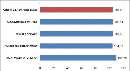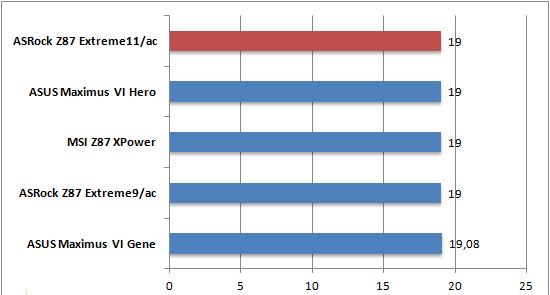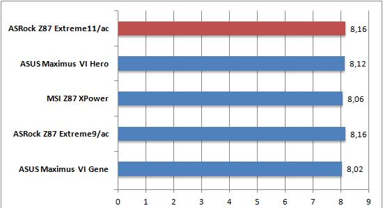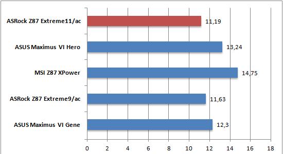 Після вивчення материнської плати підведемо підсумок. Компанія ASRock позиціонує материнську плату Z87 Extreme11 / ac як краще рішення на наборі системної логіки Z87 але, на мій погляд, це трохи не так. Материнська плата має чотири роз'єми PCI Express 3.0 x16, що дозволить зібрати досить потужну видеоподсистему, але є і інші плати з таким набором роз'ємів. Взяти хоча б GIGABYTE G1. Sniper 5. У неї теж чотири роз'єми Express 3.0 x16, причому в разі організації масиву з двох відеокарт роз'єми будуть працювати за схемою х16 + х16, в той час як у тестованої моделі тільки в режимі х8 + х16. Підсистема живлення містить 12 фаз чого, на мій погляд, цілком достатньо навіть для екстремального розгону. Але, у материнської плати MSI Z87 XPOWER підсистема харчування складається з 32 фаз. При цьому система охолодження у неї спроектована таким чином, що взагалі не потребує додаткового охолодженні. Звукову підсистему, засновану на кодеку Realtek ALC1150, теж досить часто можна зустріти на материнських платах, причому необов'язково це буде топове рішення. За кількістю елементів управління розгоном я б взагалі назвав її аутсайдером. Чого дійсно немає у конкурентів, але є у тестованої плати так це 22 роз'єму SATA. Але, я не можу уявити, кому, і для яких цілей може знадобитися така велика кількість роз'ємів, особливо з огляду на, що це не серверна материнська плата. При тому ціна на дану модель сильно завищена. Вона коштує дорожче GIGABYTE G1. Sniper 5 і MSI Z87 XPOWER, причому досить помітно. Виходячи з усього перерахованого вище, я не можу назвати її найкращою серед усіх материнських плат. Рекомендувати її до покупки можна всім категоріям користувачів, яких не буде бентежити її вкрай висока вартість.