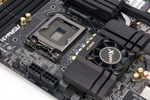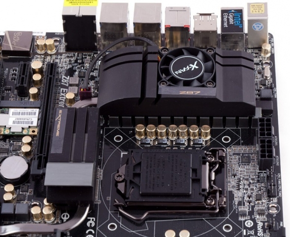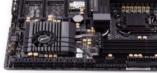 Два радіатора крім цього оснащені ще і вентиляторами охолодження. Перший радіатор з встановленим вентилятором охолоджує підсистему живлення центрального процесора. Другий радіатор розташований практично по центру плати охолоджує комутатор PLX PEX 8747. Третій радіатор, який теж оснащений вентилятором, крім чіпсета охолоджує ще і контролер LSI SAS 3008 з комутатором LSI SAS 3x24R. Всі радіатори кріпляться за допомогою гвинтів. Обороти обох вентиляторів можна регулювати через BIOS, а ось повністю їх відключити, не вийде. У номінальному режимі роботи вони практично безшумні, але якщо поставити примусово максимальні оберти, шум від вентилятора на чіпсеті стає помітним.