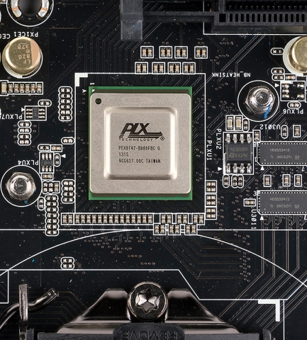 Материнська плата має досить непогане розподіл ліній PCI Express 3.0 між роз'ємами, що дозволить користувачеві зібрати найпотужнішу видеоподсистему з чотирьох графічних адаптерів. Безумовно, забезпечити такі широкі можливості тільки силами одного чіпсета неможливо. Для організації додаткових ліній PCI Express 3.0 на материнській платі розпаяний комутатор PLX PEX 8747.
