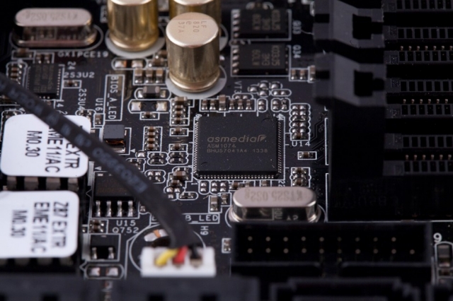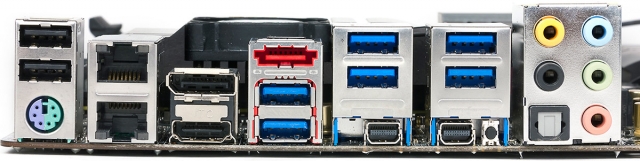 Для підключення периферійних пристроїв материнська плата оснащена 17 роз'ємами USB (10 роз'ємів USB 3.0 і 7 роз'ємів USB 2.0). На інтерфейсну панель плати виведені 6 роз'ємів USB 3.0 і два USB 2.0, ще один роз'єм USB 2.0 присутній на материнській платі, інші USB роз'єми представлені у вигляді колодок для підключення. Всі роз'єми USB 2. 0 підключені до чіпсету. Роз'єми USB 3.0 реалізовані чіпсетом і двома хабами ASMedia ASM1074.