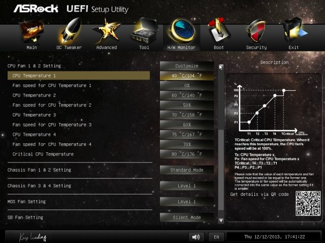 Для двох вентиляторів з системи охолодження процесора і вентилятора на чіпсеті користувач може побудувати графік залежності швидкості обертання від температури. Для інших вентиляторів можна вибрати один з режимів роботи (Level 1 - Level4).
