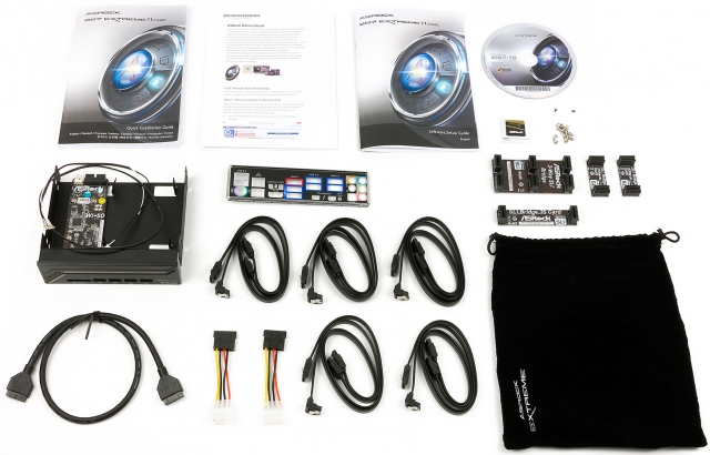 Материнська плата має досить великий комплект поставки, в якому є ряд корисних речей, які підкреслюють високий статус продукту. Комплект поставки складається з: