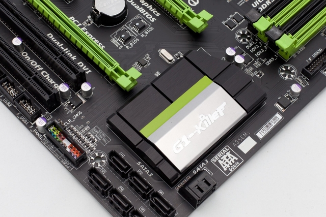Обидва радіатора мають декоративні вставки з написами «GIGABYTE» і «G1-Killer». Кріпляться радіатори за допомогою гвинтів. Управління фазами живлення процесора покладено на контролер ISL637.