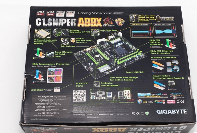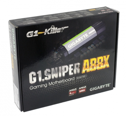 Про належність до ігрової серії недвозначно натякають написи Gaming Motherboard і G1-Killer. Внизу передньої панелі розташовані два ярлика. Перший повідомляє про підтримку процесорів А - серії, в тому числі і Black Edition, другий - про використання набору системної логіки A88X. Вся інформація про технологічні особливості материнської плати розташована на задній панелі упаковки.