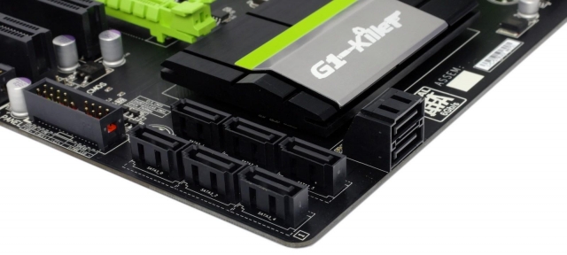 У правому нижньому кутку друкованої плати розміщені 8 роз'ємів SATA 6 Гбіт / с. З них тільки два мають кутовий підключення. Тим не менш, вони не будуть перешкоджати встановленню габаритних відеокарт навіть в разі організації масиву. Всіма роз'ємами підтримуються масиви рівнів RAID 0, 1, 5, 10. Робота SATA роз'ємів реалізована виключно силами набору системної логіки.