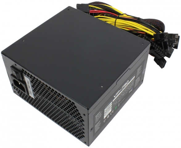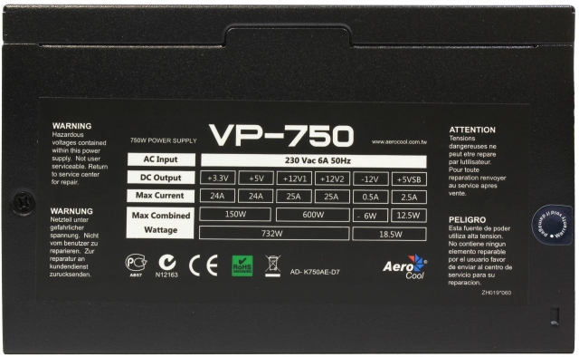 Останнім елементом системи, який залишилося розглянути є блок живлення. В системі використовується блок живлення AeroCool VP-750 номінальною потужністю 732 Вт. Зауважу, що це досить стара модель, яка не має сучасного сертифіката 80 Plus. Залежно від навантаження ККД блоку живлення знаходиться в межах від 77,5% до 80,8%. Максимальний ККД досягається при 50% навантаженні, а при максимальному навантаженні він становить 79,2%. Це означає, що блок живлення не зовсім ефективно перетворює споживану енергію, що тягне за собою більший нагрів внутрішніх елементів блоку і трохи більших витрат у порівнянні з блоками живлення мають сертифікат 80 Plus. Проте, заявлений виробником показник напрацювання на відмову складає більше 120000 годин. Його незаперечною перевагою є низька вартість. Блок живлення має дві лінії +12 В, кожна з яких розрахована на максимальний струм в 25 А. Таким чином, максимальна потужність по виходу + 12 В може становити Потужність 600 Вт.