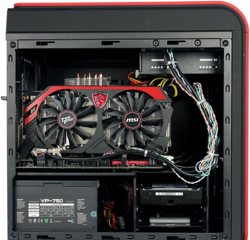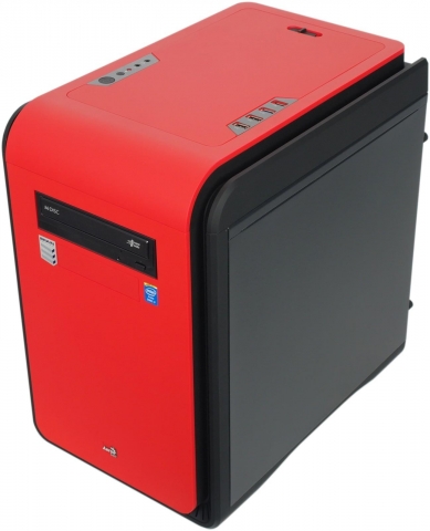 Система зібрана в корпусі AeroCool DS Cube, відмінною рисою якого є горизонтальне розташування материнської плати. В системі використовуються компоненти компанії MSI серії GAMINIG, в оформленні яких переважають чорний і червоний кольори. Мабуть під стати їм підібраний і корпус. З великого вибору колірних рішень, в яких може бути виконаний корпус AeroCool DS Cube, співробітники компанії вирішили зупинитися на червоно-чорному кольорі. Знявши ліву бічну кришку, бачимо наступне розташування компонентів.