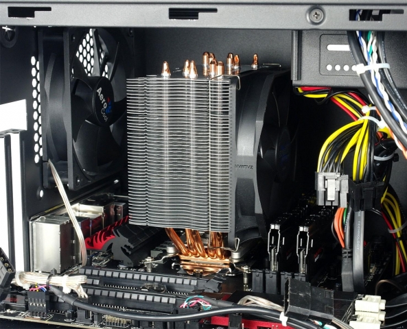 В системі використовується центральний процесор без розблокованого множника - Intel Core i7-4770 з номінальною частотою 3400 МГц. В якості системи охолодження центрального процесора використовується кулер ZALMAN CNPS10X Performa з встановленим вентилятором діаметром 120 мм, що працюють на обдув. Зверніть увагу, що встановлений на обдув вентилятор заважає установці модуля оперативної пам'яті в ближній до процесора роз'єм. Також користувачеві варто врахувати, що корпус оснащений одним внутрішнім відсіком 5, 25 дюймів і одним відсіком 3,5 дюйма. Зібрано система досить якісно без нарікань. Всі дроти укладаються і закріплюються стяжками, що не тільки покращує внутрішній вигляд, але і не заважає вільному руху повітря всередині корпусу для кращого охолодження компонентів.