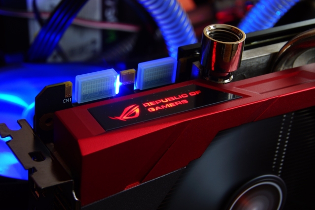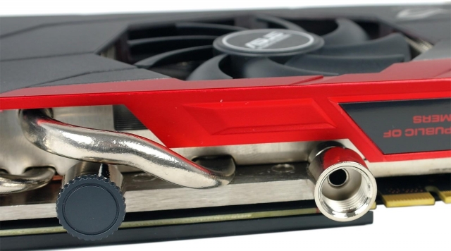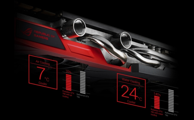За інформацією компанії ASUS така система охолодження дозволяє знизити температуру відеокарти на 7 градусів в разі повітряного охолодження і до 24 градусів в разі використання водяної системи охолодження.