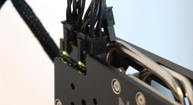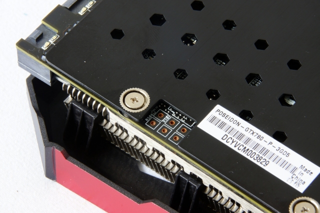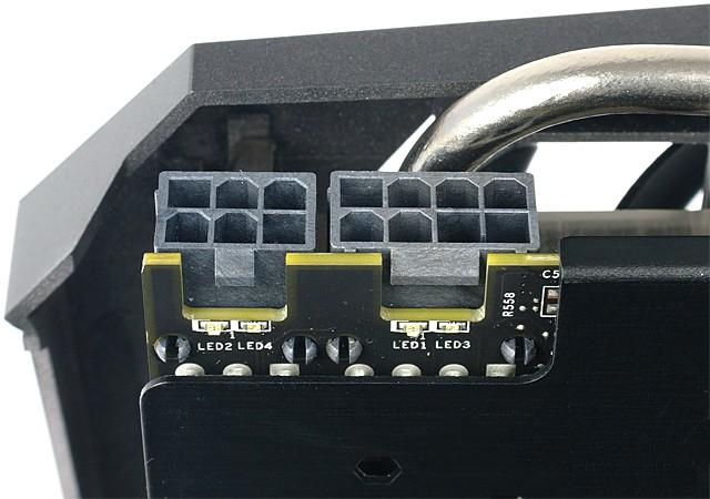 Поруч з кожним з роз'ємів додаткового живлення розташоване по два світлодіоди, які сигналізують про надходження напруги на роз'єм. На відеокарті також є два роз'єми для побудови масиву. Зі зворотного боку друкованої плати трохи нижче роз'ємів додаткового живлення присутні контактні площадки VGA HotWire для з'єднання відеоадаптера з материнськими платами з серії ROG.