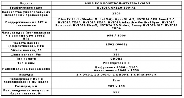 Під кінець 2013 року компанія ASUS вирішила порадувати своїх шанувальників, представивши відразу дві моделі відеокарт з серії ROG. Першою була представлена ??відеокарта ASUS ROG Mars 760 - двухпроцессорная відеокарта на базі двох графічних процесорів GK 104. Слідом за цією моделлю була представлена ??відеокарта ASUS GeForce GTX 780 POSEIDON PLATINUM. Про неї і піде мова в даному огляді. Дана модель оснащена нестандартною системою охолодження, яка дуже рідко зустрічається на відкритих. Деякі моделі високопродуктивних материнських плат орієнтованих на оверклокерів і геймерів, наприклад, GIGABYTE G1. Sniper 5 виробники оснащують системою охолодження, радіатори якої можуть охолоджуватися і повітрям і за допомогою води. Аналогічною системою охолодження оснащена нова модель ASUS GeForce GTX 780 POSEIDON PLATINUM, в якій для охолодження графічного процесора можна використовувати як повітряне, так і водяне охолодження. Це перша модель компанії ASUS з такою системою охолодження. Що являє собою дана відеокарта, наскільки вдало і виправдано застосування такої системи охолодження спробуємо поступово розібратися, а почнемо з технічних характеристик відеокарти, які представлю в таблиці.
