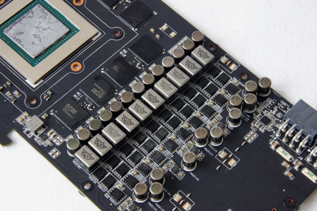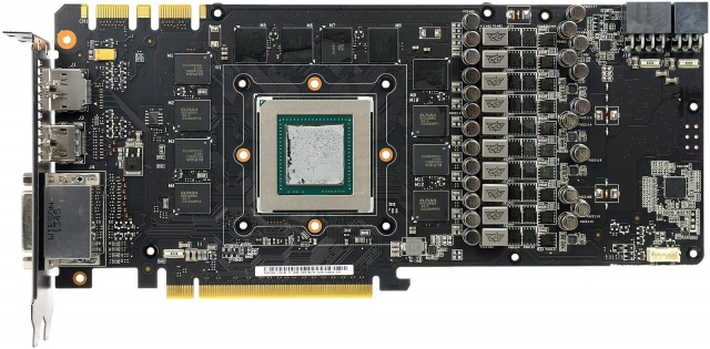Ясна річ, що у такий відеокарти розводка друкованої плати відрізняється від стандартної моделі. Знявши з відеокарти систему охолодження, користувач відразу помітить, що основні зміни торкнулися підсистеми живлення, яка отримала додаткові фази харчування.