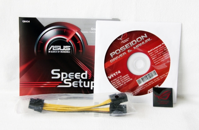 Останнім часом вся продукція серії ROG має досить бідні комплекти поставки. Дана відеокарта не стала винятком. Разом з нею користувач отримає тільки керівництво користувача, програмне забезпечення, перехідник додаткового живлення і диск з логотипом серії ROG.