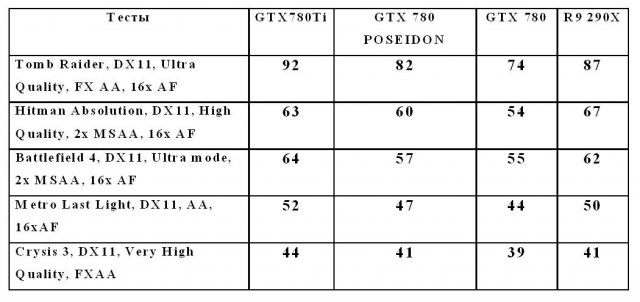 Для тестування в ігрових додатках частоти роботи графічного процесора і відеопам'яті були знижені до номінальних для ASUS GeForce GTX 780 POSEIDON PLATINUM значень. Як суперників для GTX 780 POSEIDON були взяті відеокарти: