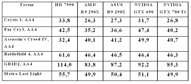 NVIDIA GeForce GTX 690, NVIDIA GeForce GTX 780 Ti, AMD Radeon R9 290X, AMD Radeon R9 290, AMD Radeon 7990. Всі відеокарти проходили тестування на номінальних частотах. Для відеокарт AMD Radeon R9 290X / R9 290 і ASUS Radeon R9 290X DirectCU II була встановлена ??максимальна продуктивність систем охолодження (режим Uber). Тестування проводилося в дозволі 2560 х 1600 пікселів і максимальних налаштуваннях графіки. Результати тестування представлені нижче.