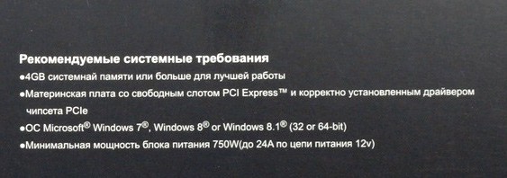 Крім цього, тут розташовано опис відеовиходів і вказані системні вимоги. У системних вимогах користувачеві необхідно звернути увагу на потужність блоку живлення, яка повинна бути не менше 750 Вт, а мінімальне значення струму, по лінії 12 В, має становити 24 А.