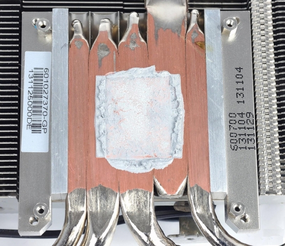 Подивившись на межі відбитка термопасти, видно, що з графічним процесором контактують всього три з п'яти теплових трубок, та й то не всією площею.