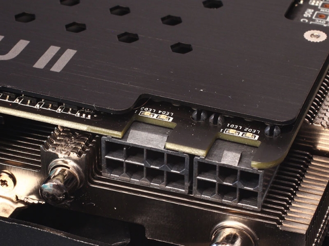 Всього на друкованій платі розташовано 16 таких мікросхем. Частота роботи мікросхем відеопам'яті збільшена до 5400 МГц. Частота роботи графічного процесора теж збільшена і становить 1050 МГц. Хочу зазначити, що у випадку з Radeon R9 290X це не номінальна, а максимальна частота графічного процесора, на якій він може працювати. Додаткове харчування відеокарта отримує через два роз'єми: 6-pin і 8-pin. Поруч з кожним з роз'ємів розташовані два світлодіоди, що сигналізують про їх активності.
