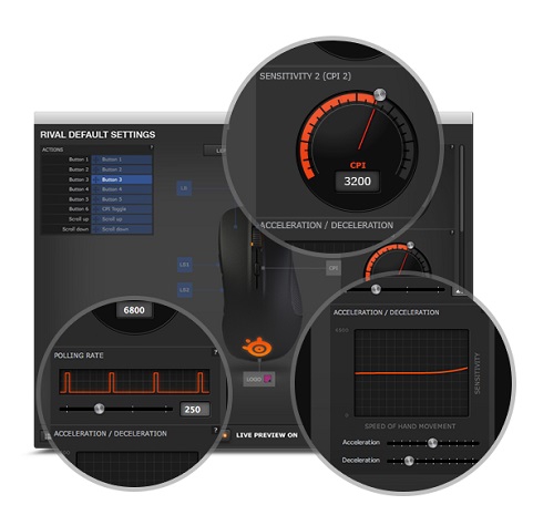 На жаль, невелика кількість додаткових кнопок відбивається на зручності використання маніпулятора в різних ігрових жанрах. Основними іграми, в яких геймер з Rival в руці буде відчувати себе найбільш комфортно, стануть шутери, де миша показує найбільш впевнену поведінку. Перемикання рівня чутливості сенсора в процесі гри безумовно покращує результати стрільби. Для цього в кожному ігровому профілі за допомогою фірмового програмного забезпечення були виставлені два рівня, змінювані в залежності від ситуації, що склалася. Для снайперської стрільби ступінь чутливості миттєво знижувалася до 100 dpi, а в динамічних перестрілках з великою кількістю супротивників збільшувалася до максимальних 6500 dpi. Паралельно з перевагами маніпулятора були виявлені і його деякі недоліки. По-перше, контролера явно не вистачає окремого перемикача профілів. Звичайно, ця функція може бути призначена одній з бічних кнопок, але в такому випадку в розпорядженні геймера залишиться всього один програмований елемент. По-друге, дуже корисною була б можливість установки більше двох значень ступеня чутливості сенсорного датчика, так як двох рівнів часто не вистачає для гнучкої зміни режиму роботи. Наприклад, в динамічних шутерах потрібно мінімум три рівні: максимальний - для миттєвого реагування на атаку супротивника, середній - для звичайних рухів і мінімальний - для ведення снайперської стрілянини. По-третє, візуальний контроль за встановленим режимом забезпечується зміною кольору підсвічування, проте розробниками не був врахований той факт, що під час роботи всі зони ілюмінації будуть закриті рукою. Перераховані недоліки можна назвати критичними, але вони можуть проявитися в роботі через деякий час.