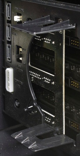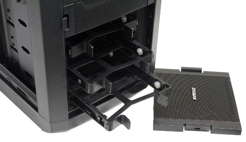 Харчування накопичувачів в кошику походить від роз'єму живлення PATA, а вентилятор їх охолодження розміщений безпосередньо позаду самої кошика і підключається до виділеного роз'єму «Hot Swap» з вибором низькою або високій швидкості обертання за допомогою розташованого поруч перемикача. Також цей вентилятор можна підключити до будь-якого з шести роз'ємів контролера оборотів, що має на увазі більш плавне регулювання швидкості. Однак, в цьому випадку швидкість усіх шести вентиляторів буде абсолютно ідентична. Охолодження кошика для накопичувачів проводиться 92-мм вентилятором. При необхідності, кошик для накопичувачів можна повністю демонтувати, просто викрутивши шість шурупів з кожної її сторони. Кошик для накопичувачів оснащена трьома роз'ємами «SATA 2», роз'ємом типу «Молекс», роз'ємом для підключення вентилятора з трьома контактами і не найзручнішим двохпозиційним перемикачем швидкості вентилятора. Використання роз'єму «SATA 2» робить безглуздим підключення за допомогою даної кошика будь-яких моделей твердотільних накопичувачів, внаслідок вкрай низької пропускної здатності зазначеного стандарту. Теоретично це не стосується моделей твердотільних накопичувачів, розроблених безпосередньо під стандарт «SATA 2», але в реальності і від їх підключення слід утриматися, так як можуть виникнути проблеми сумісності. Гарантія сумісності можлива тільки при використанні сучасних моделей SSD виробництва компанії «Samsung», наприклад, Samsung 250GB SSD 2.5" SATAIII MZ-7TD250BW і Samsung 256GB SSD 2.5" SATAIII MZ-7PD256BW, а також стандартних жорстких дисків. В іншому випадку слід скористатися варіантом з підключенням безпосередньо до роз'ємів на материнській платі.