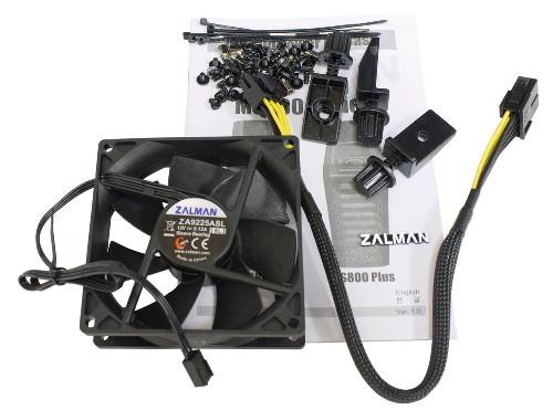 Комплектація комп'ютерного корпусу «Zalman MS800 Plus» містить набір необхідного кріплення, інструкцію по експлуатації, фірмову наклейку з логотипом «Zalman», подовжувач кабелю живлення процесора, 92-мм вентилятор без підсвічування, а також оснащення внутрішньої планки, необхідне для додаткової підтримки краю різних карт розширення і комплектного вентилятора. Комплектація також включає попередньо змонтовані виробником вентилятори: 92-мм без підсвічування - для охолодження кошика з накопичувачами, 120-мм з синім підсвічуванням - для верхньої панелі корпусу і 120-мм без підсвічування з крильчаткою білого кольору - для задньої стінки корпусу. Розробник передбачив додаткові посадочні місця для 120-мм вентиляторів на верхній панелі і днище корпусу. Дуже шкода, що жодного вентилятора на знімній бічній панелі не передбачено, адже це досить суттєво погіршить повітрообмін всередині системного блоку. Зате є велике акрилове вікно, через яке можна демонструвати друзям неперевершену потужність або унікальні особливості конфігурації свого ПК, що може виявитися навіть більш затребуваним якістю в середовищі потенційних власників подібних корпусів.